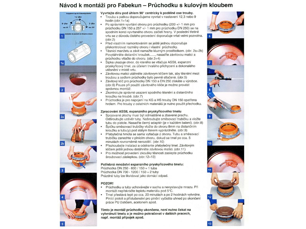 FABEKUN ® priechodka s integrovaným guľovým kĺbom je určená pre špeciálne napojenie s možnosťou vychýlenia prípojky 0-13 stupňov. DN 500-600/150KG. Vŕtaný otvor do kanalizačnej stoky má mať priemer 200mm (+-1mm).
