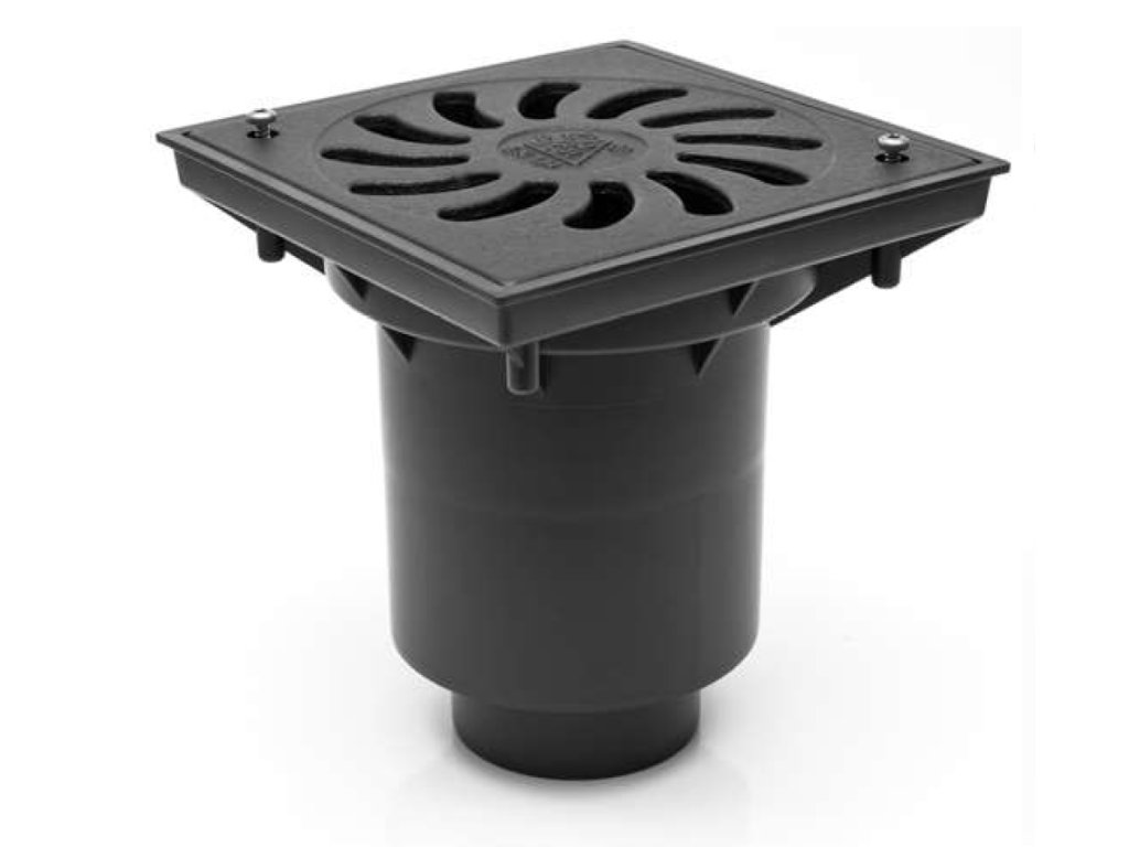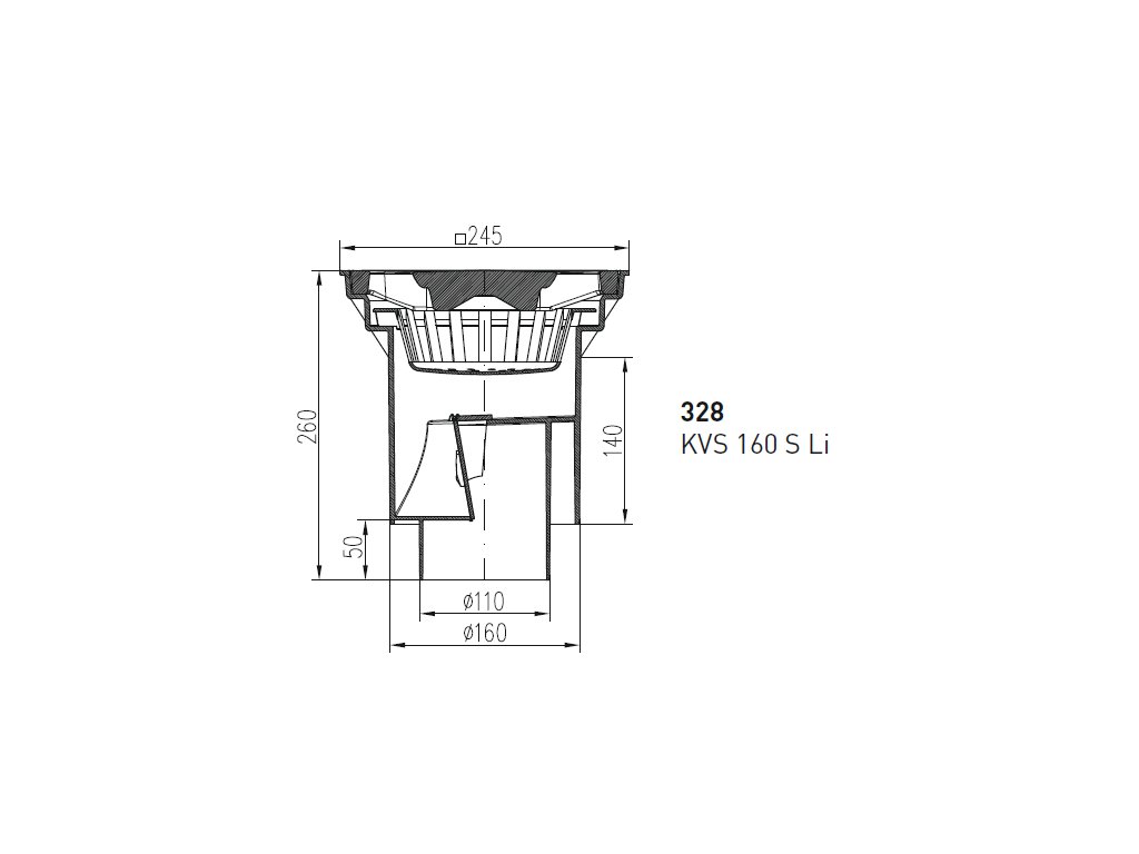 Kanalizačný vpust spodný KVS 160/110-250 s liatinovou mriežkou 245x245mm, nosnosť 12,5t so suchou klapkou, spodný ostok d110mm alebo d160mm Chudob 328 - KVS 160 S Li Výrobky obsahujúce suchú protizápachovú klapku sú prevažne určené pre montáž v exteriéri.