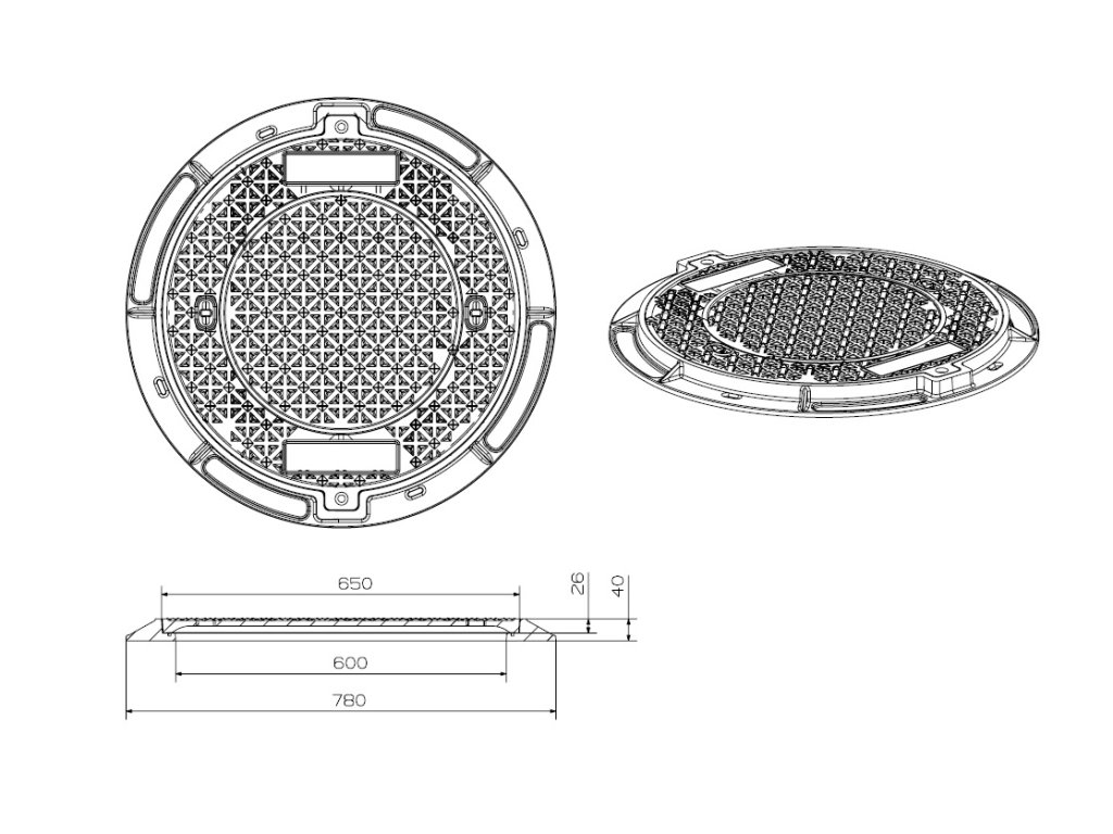 Pochôdzny kompozitný poklop vhodný na šachtu s priemerom 600 mm a zaťažením až 1,5 t Kompletné prevedenie vrátane rámu. Vhodný na plochy používané pre chodcov a cyklistov, prípadne iné zatrávnené plochy / Hmotnosť: 14 kg