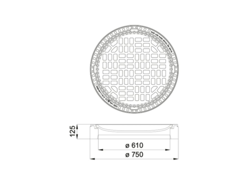 Kruhová liatinová mreža KBB0M B125, rám Begu, nosnosť 12,5t, priemer 600mm