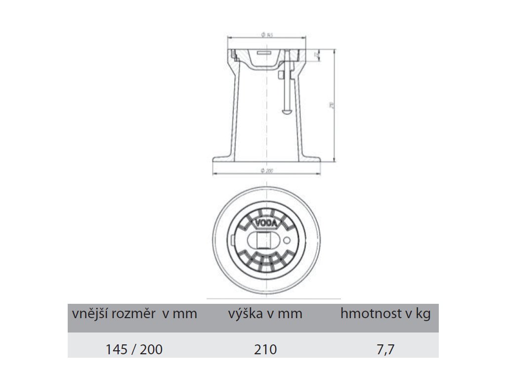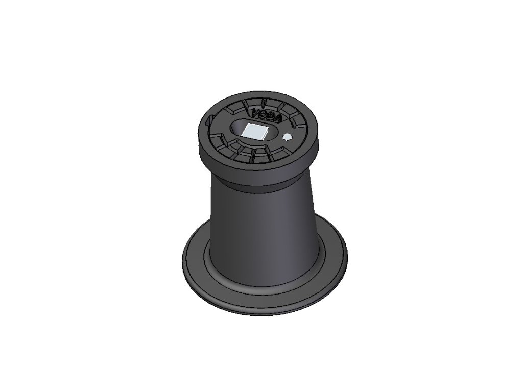 - kruhový poklop zo sivej liatiny s mostíkom z nehrdzavejúcej ocele na otváranie, spojenie oceľovým čapom s telesom poklopu, kruhové teleso, kužeľová sivá liatina, kužeľový tvar, výška 210 mm