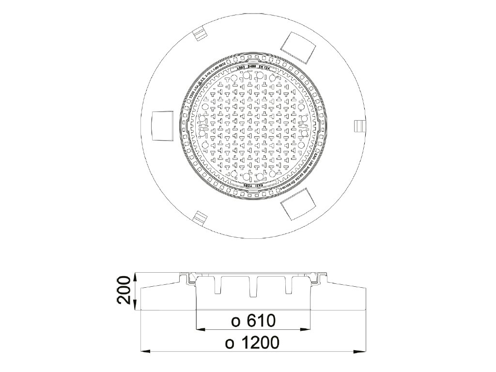 poklop bez pántu, horizontálna PUR tlmiaca vložka na ráme, bez pružinového zaistenia veka v ráme - KDG03 Materiál: Betón, Liatina Hmotnosť: 347 kg Norma: EN124-2 Trieda zaťaženia: D400 Vysoké dopravné zaťaženie